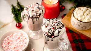 A festive Candy Cane Hot Chocolate layered with peppermint, marshmallow, and chocolate flavour using just...