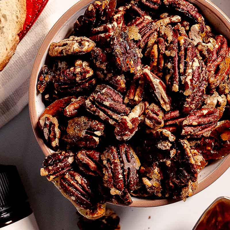 Give your guests a holly, jolly surprise with these spicy candied pecans!